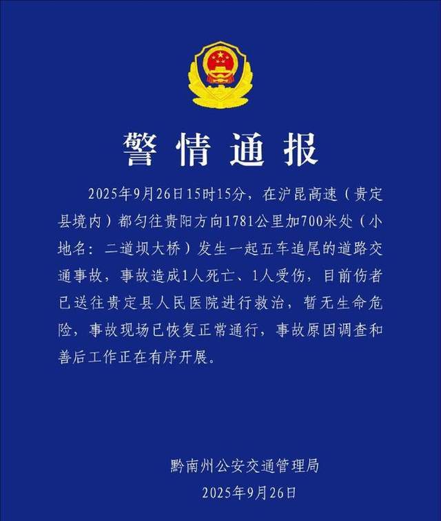 9月26日傍晚,黔南交警发布警情通报:2025年9月26日15时15分,在沪昆高速(贵定县境内)都匀往贵阳方向1781公里加700米处(小地名:二道坝大桥)发生一起五车追尾的道路交通事故,事故造成1人死亡、1人受伤,目前伤者已送往贵定县人民医院进行救治,暂无生命危险,事故现场已恢复正常通行,事故原因调查和善后工作正在有序开展。
